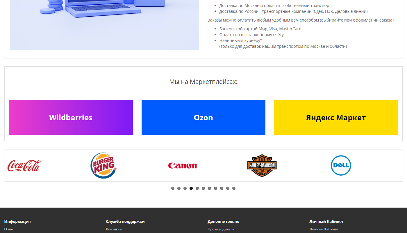 Всем привет, очень часто товары вашего интернет магазина представлены на различных торговых площадках (Wildberries, Ozon, Яндекс Маркет), в этой статье я покажу вам как вывести на домашнюю страницу CMS OpenCart 3.0. блок ссылок на маркетплейсы, без использования фирменных логотипов (просто текст и css стили).